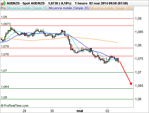 Notre point d'entrée est à 1.0738 NZD. L'objectif de cours de notre scénario baissier se situe à 1.0640 NZD. Pour préserver le capital engagé, nous vous conseillons de positionner un stop de protection à 1.0765 NZD.