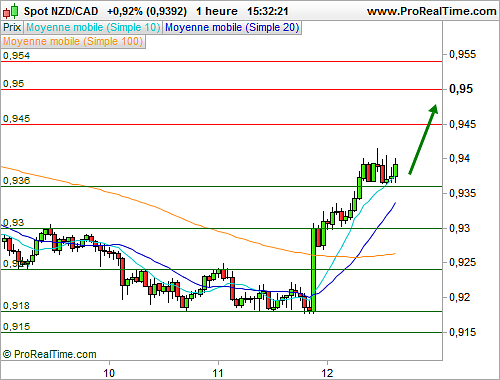 L'analyse graphique en données horaires de la parité de devises Dollar Néo Zélandais Dollar Canadien (NZDCAD) permet d'identifier une tendance haussière à court terme.